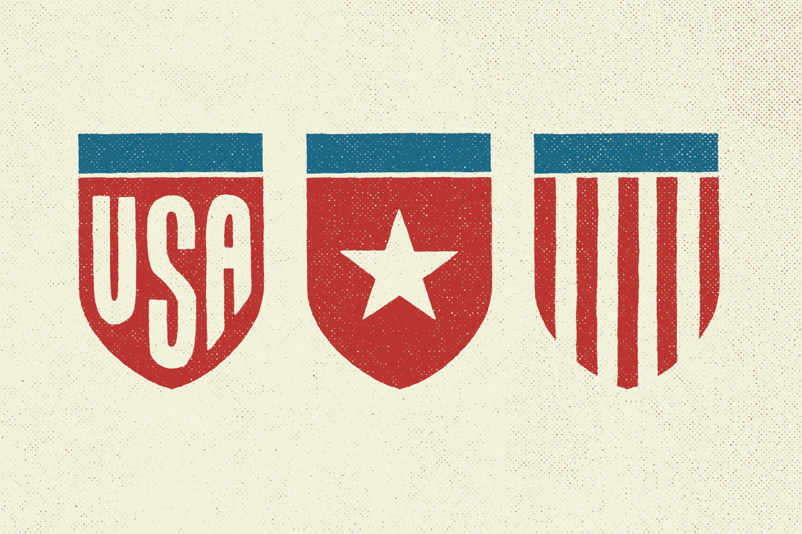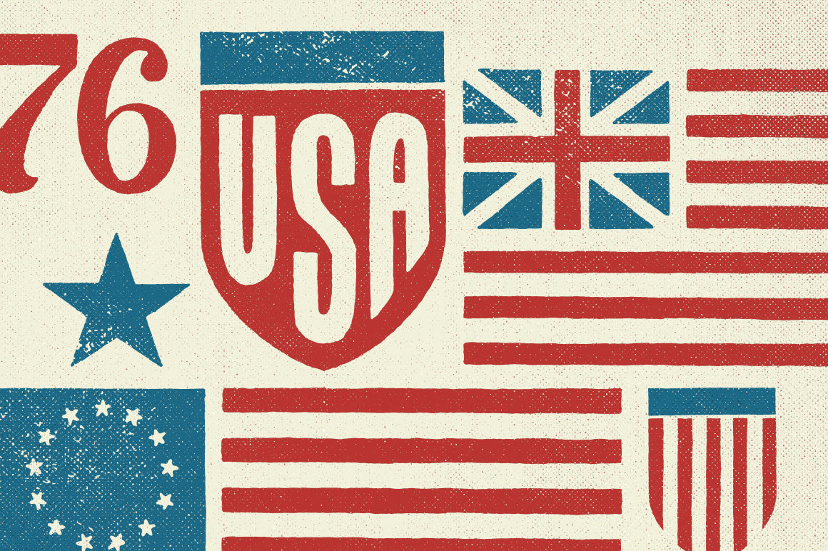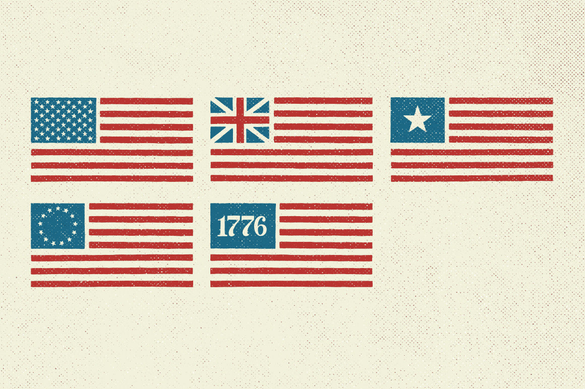 This collection is comprised of the most iconic historic American flags from history. The Betsy Ross? Grand Union? it's all here. This set looks hand crafted and authentic because it was hand illustrated on a piece of paper and then scanned in at a high resolution of 1,400 PPI before being converted to vector EPS format and crisp transparent PNG format. The result is a high-quality flag collection that retains an imperfect and organic feel. I also threw in some bonus stars and stripes swagg, some USA shields (cause 'Merica!) and a hand-illustrated “1776”. You're ready for the Fourth of July now.