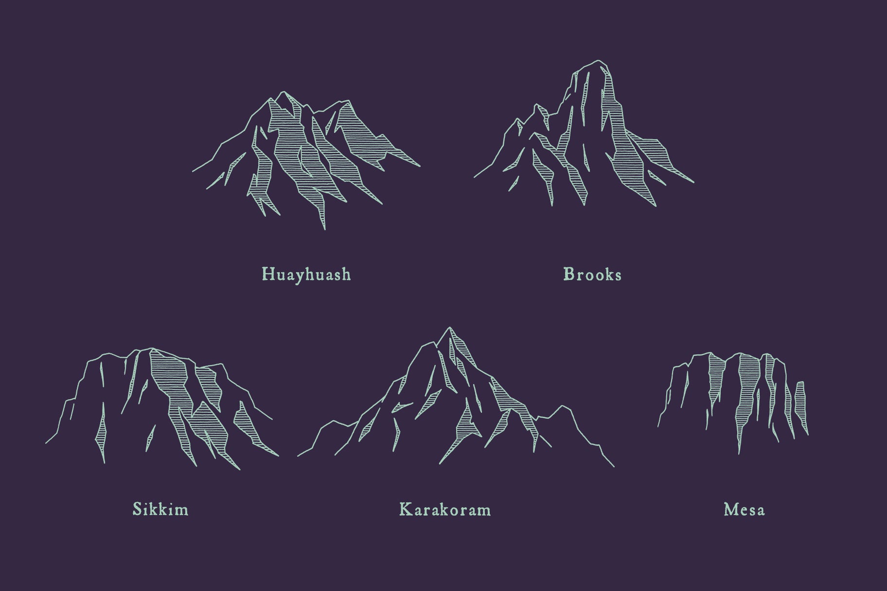 This collection was fun to sketch out. I’ve always loved the mountains. This collection contains a variety of hand illustrated mountain ranges, taking you around the world from the Arizona Mesa to South America to India. Each mountain was sketched and inked by hand before scanning. As an added bonus, 3 styles of each mountain range are included; contour, solid, and woodcut. Cheers. The included mountain ranges are Brooks, Huayahash, Karakoram, Sikkim, and Mesa style.
