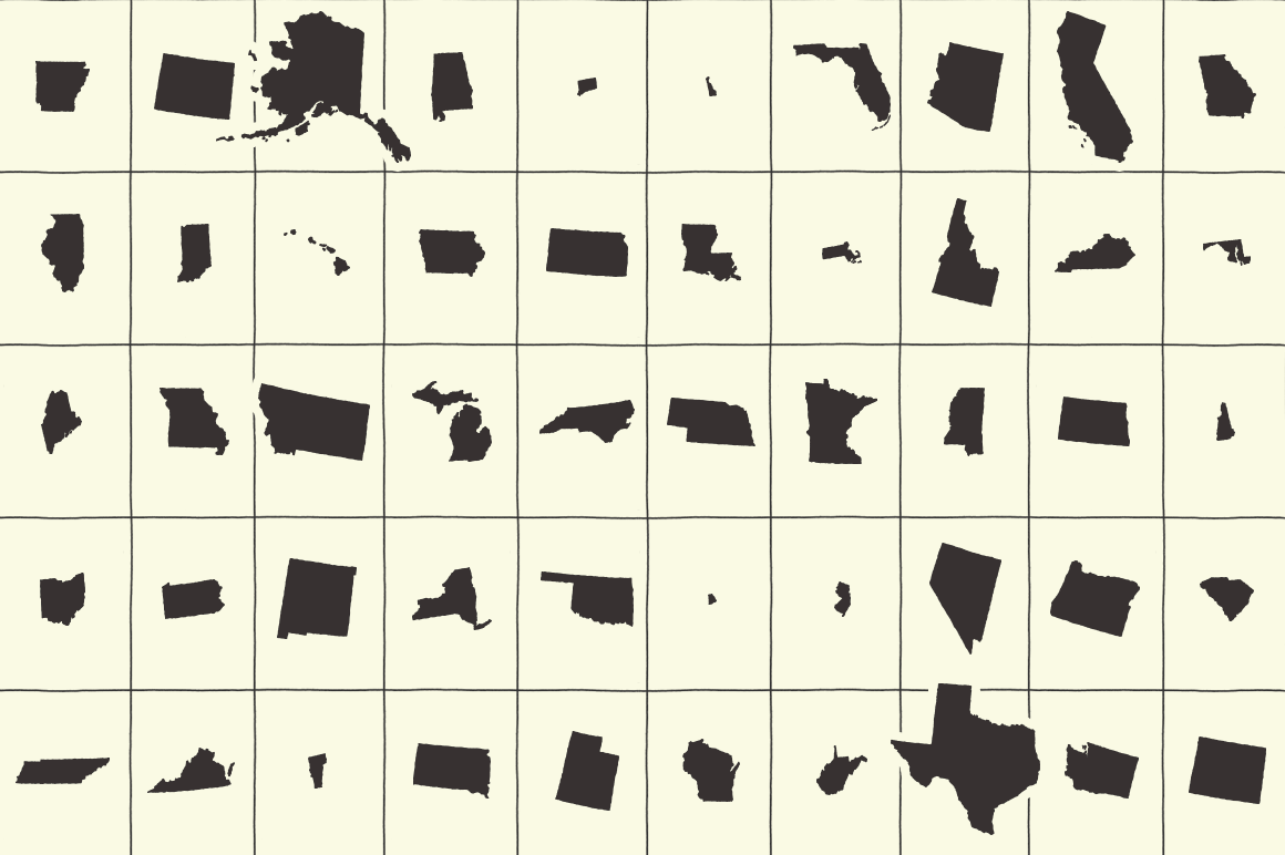 All of the states were drawn by hand in relative to scale to each other. As a result, the larger states have greater detail than the smaller states as the original illustrations were larger (compare the detail in the massive Alaska state to the the tiny and less-detailed Rhode Island state in the product previews).